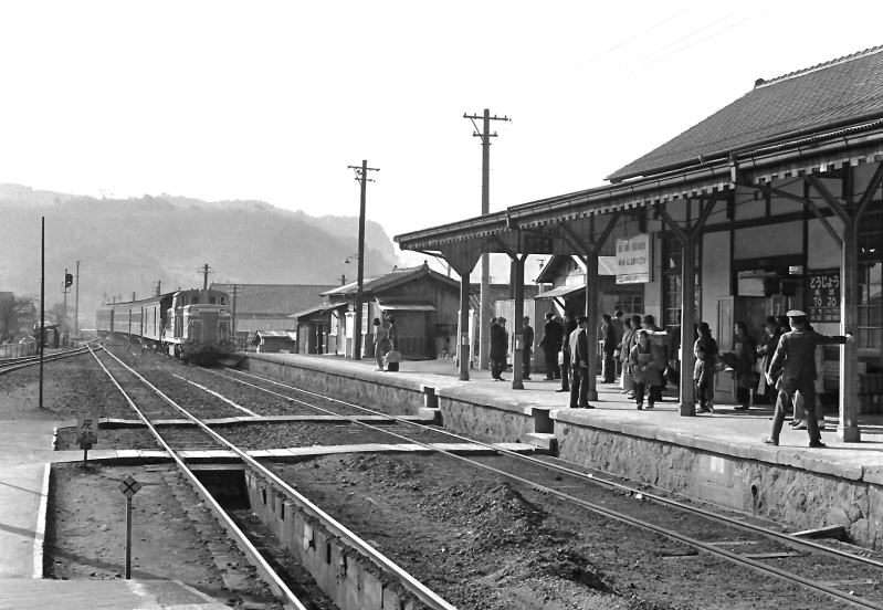 | 昭和46(1971)年3月 朝の東城駅 DE10が牽く広島行き列車。 拡大画像 |