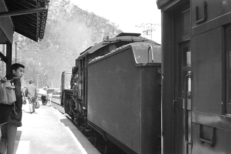 | 昭和46(1971)年3月。 伯備線生山に到着した米子行き。C58が牽引。 |