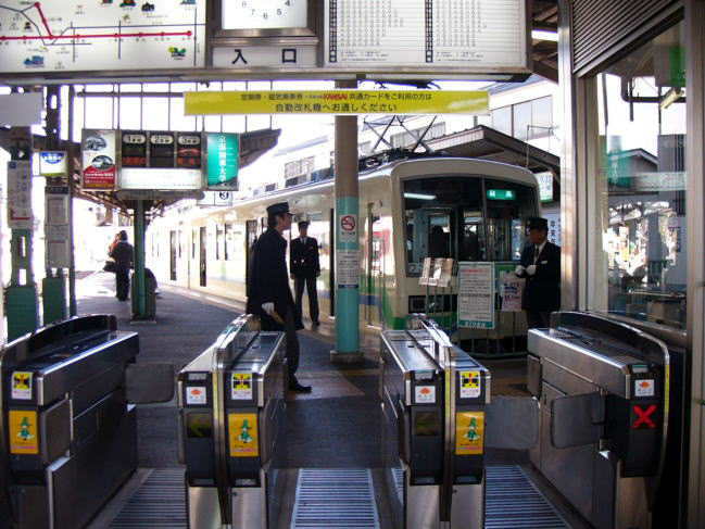 | 改札口のすぐ向こうに、鞍馬行きの電車が止まっています。改札口から10歩で電車の中。 |