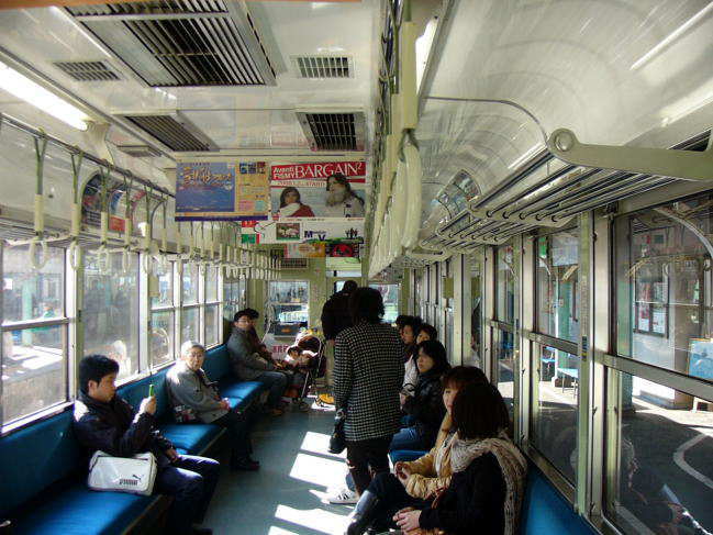 | 723の車内。鞍馬行きは満員ですが、こっちはこの程度。 何となく昭和っぽい雰囲気が漂う車内です。 |
