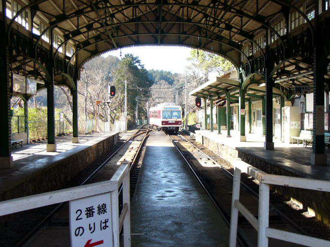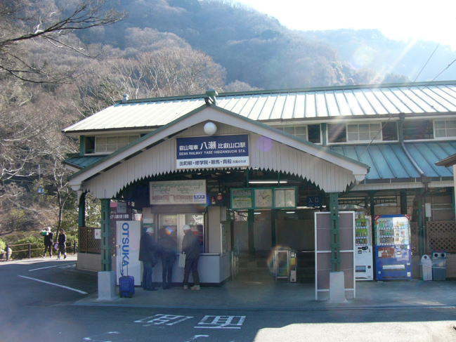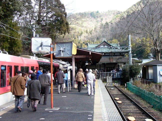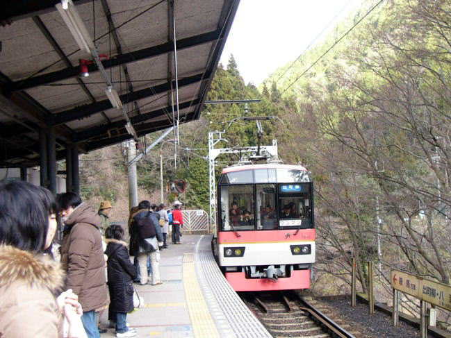| 鞍馬駅。続々と降りてくる鞍馬寺の参拝客。到着のたびにトイレが行列になります。 行列が終わった頃に次の電車が到着。 |
