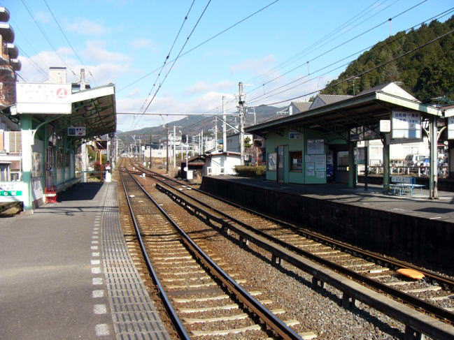 | 駅舎と入り口。最近のJRの小さな駅にはない丁寧さを感じます。特にギザギザが・・。 周辺は京都北山の深い山すそ。 |