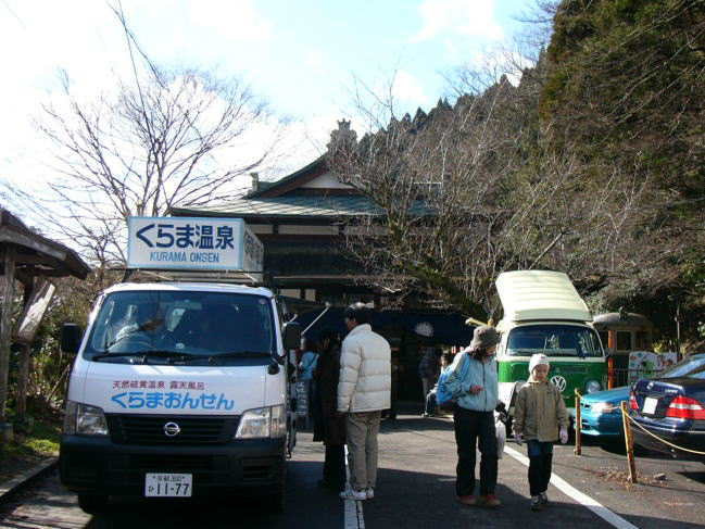 | 駐車するマイカーと温泉の送迎車とフランクフルトの屋台で結構一杯の駅前広場。 |