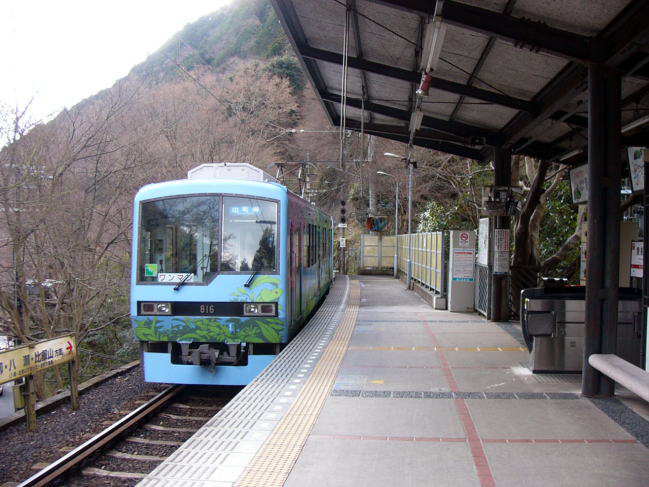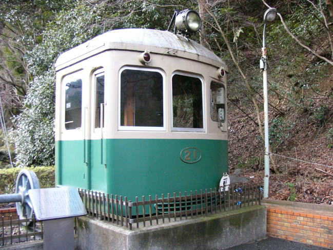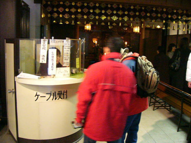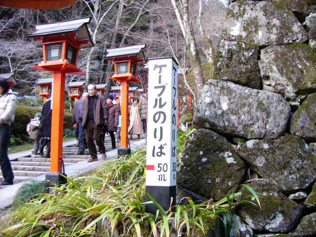 | ケーブル乗り場も○○殿と言います。ケーブルは「受付」で申告。この日は混雑していて 待ち時間25分~30分となっていました。若いもんなら登って降りてこれる時間です。 このケーブルも目的の一つでしたが、待ち時間を見て嫌気がさして、さっさと駅に向かいました。 |