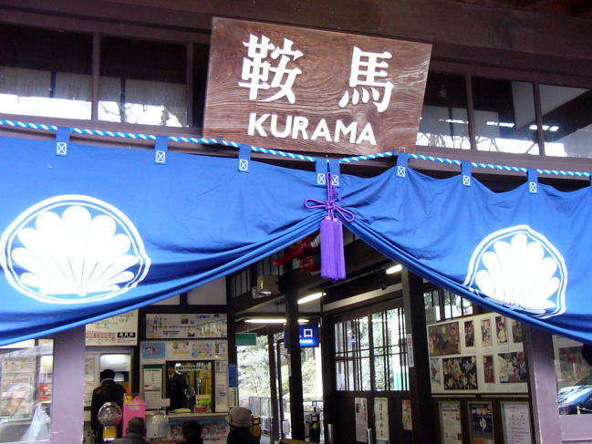| 垂れ幕を掲げた鞍馬駅の入り口 待合室にストーブを囲むベンチがあります。 |