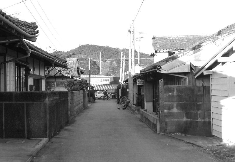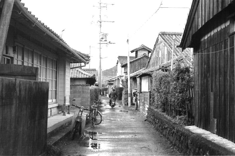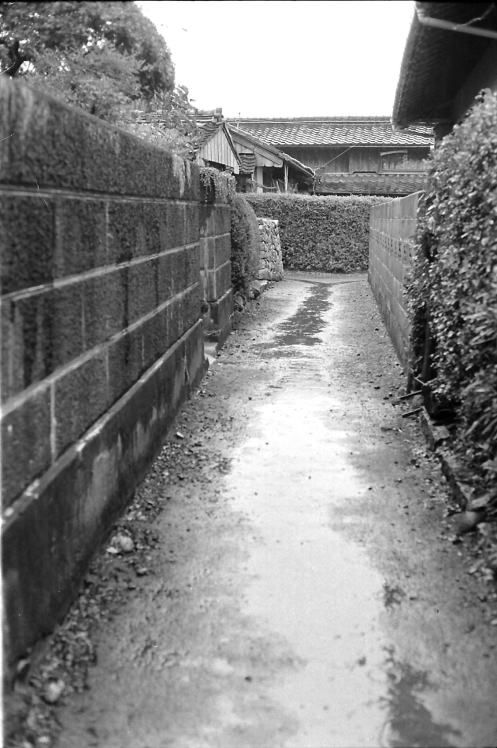 | 下里の集落の中の路地。村全体走り回って探偵ごっこをしたもんです。 塀は飛び越え、垣根には穴をあけてケモノ道ならぬ、ガキの道ができていました。 |