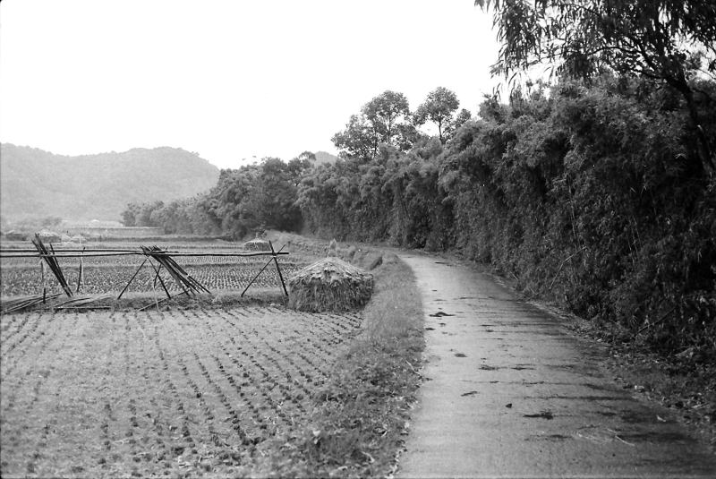 | 川に沿って続く防風林と天満への道。昭和49(1974)年9月。 |