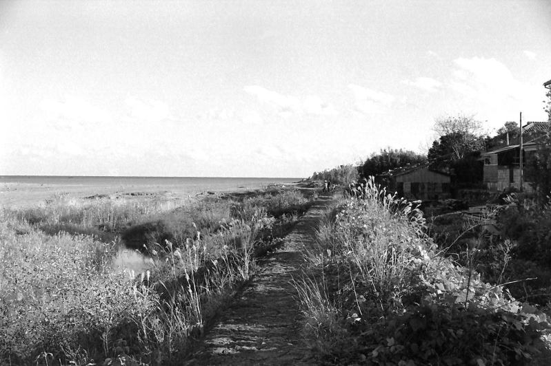 | 大浜へ向かう堤防の道。行くにつれて波音が大きくなって来る。 |