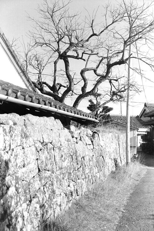 | 石の塀と柿の木。登るのにちょうどよい枝ぶり。 |