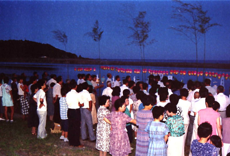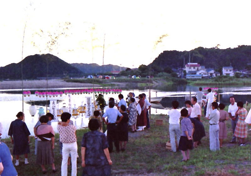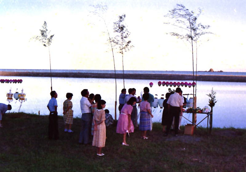 | 初盆の灯篭流しの準備。太田川河口付近。 昭和50年代後半。 |