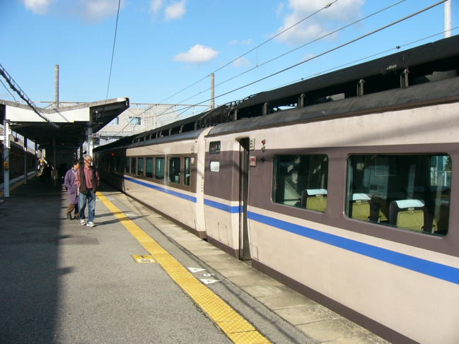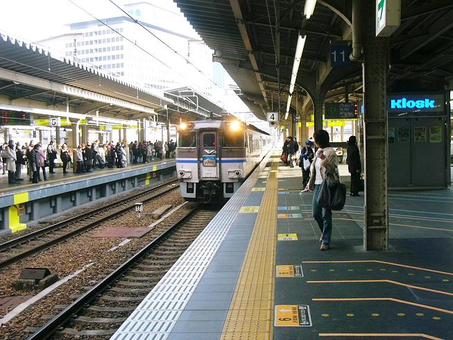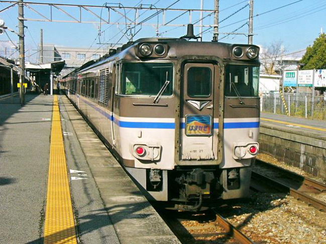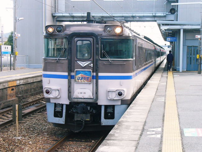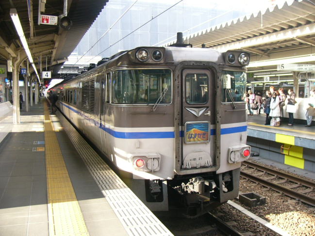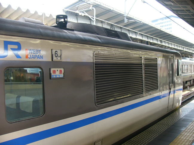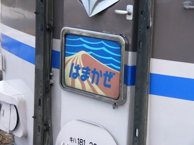 | 大阪駅4番線に入ってきたキハ181の特急「はまかぜ1号」 この列車は新幹線から乗り換え可能な姫路経由であるためか、 新大阪ではなく、珍しい大阪駅始発の山陰方面行き特急列車。 |