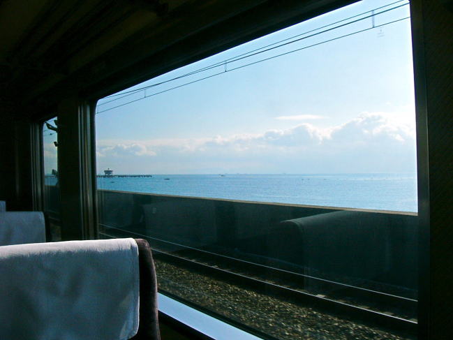 | 須磨浦公園あたりの車窓。しかし、先ほどからちょっと不吉なアナウンスが・・・。 |