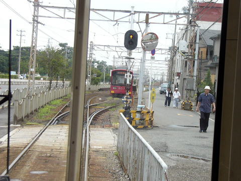 | 住吉駅の2番線を出て交差点をわたる恵美須町行き。 どこからアナウンスしているのか、電車が来ると、「電車が通過します」という声がします。 聴 く |