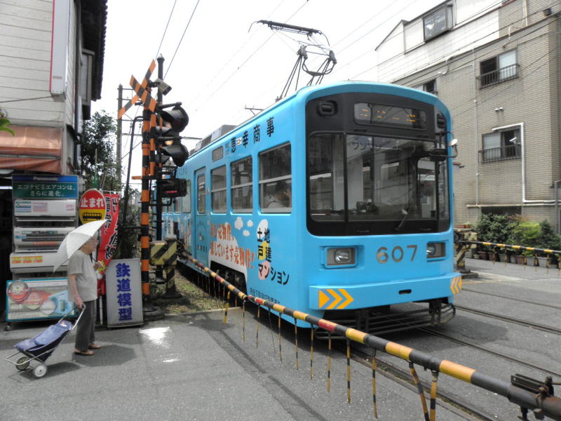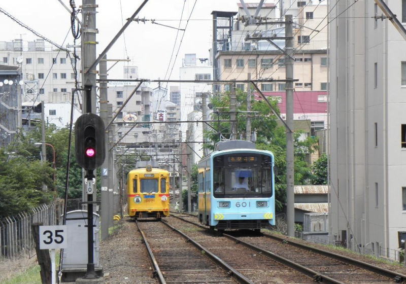 | 築堤を下って下町の直線コースを走って行く阪堺線の電車。 |