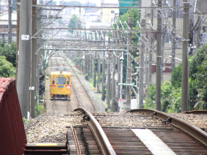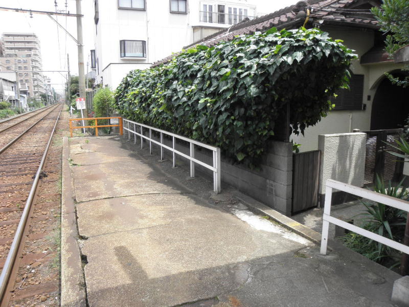 | カーブを曲がるとすぐそこに聖天坂の駅が見えます。坂という割には全く平坦な線路。 |
