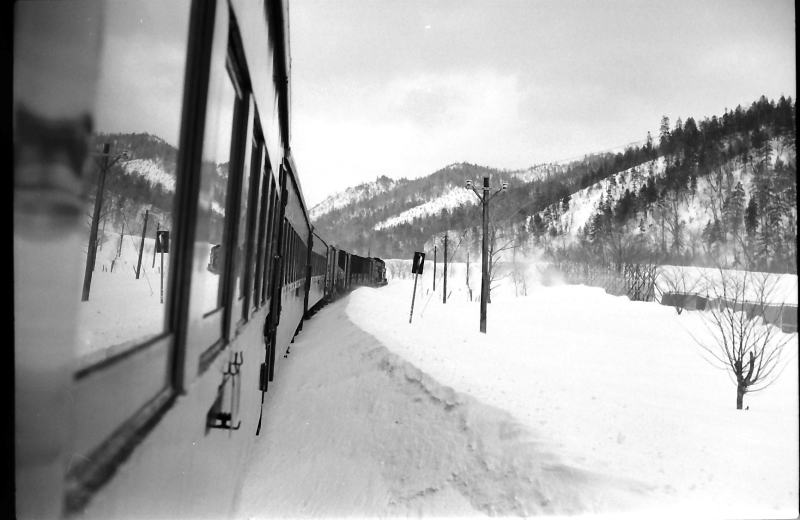 | 昭和49年3月 石北本線網走行き527列車より。上川を過ぎたあたり。DD51が牽く混合列車。 客車はオハ62系が2両とオハユニ62が1両。これから石北峠の厳しい難所を越えます。 拡大画像 |