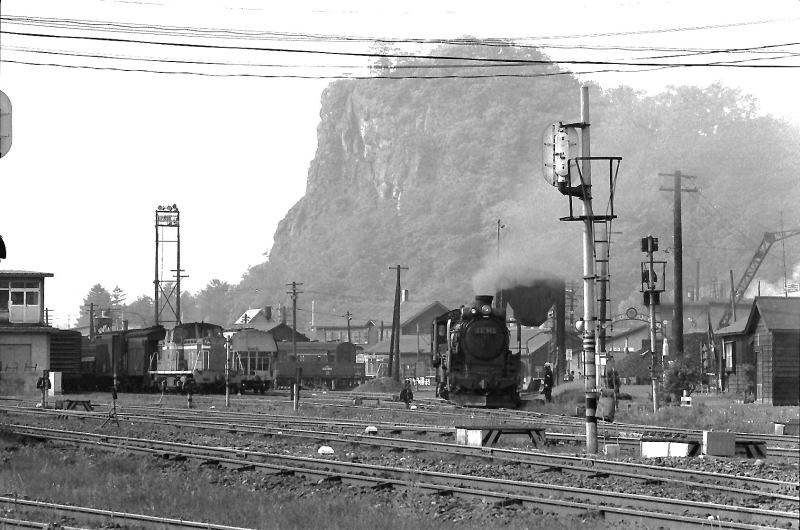 | 昭和49年9月 岩山がのしかかって来るような遠軽機関区 この当時は石北本線は遠軽~網走間だけD51とC58が走っていました。そのほかはDD51が。 |