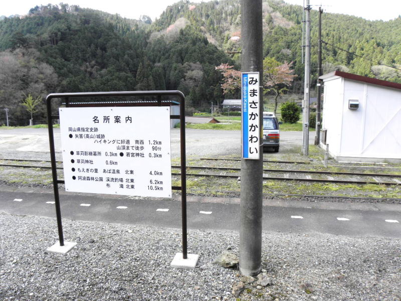 | 峠の手前の美作河井駅。録音当時はここで対向列車が遅れて来てイライラしましたが、反対側の線路はすでにありません。 |