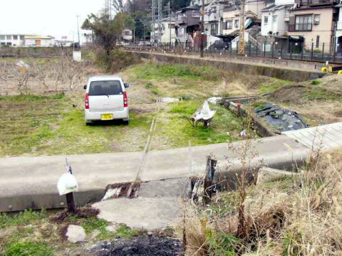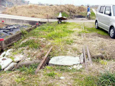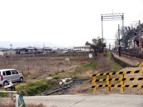 | 南海高野線 紀伊清水から九度山方向に300メートルくらい行ったところの 踏み切り。左端の車の横、手押し車のある所が道床になっていて、レールが 残っています。 |