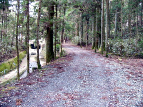 | バスの終点、奥の院前バス停付近。 地図で見ると、この道も森林鉄道本線跡ではないかと・・・。 |