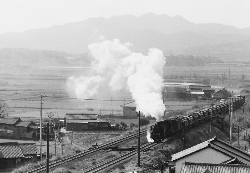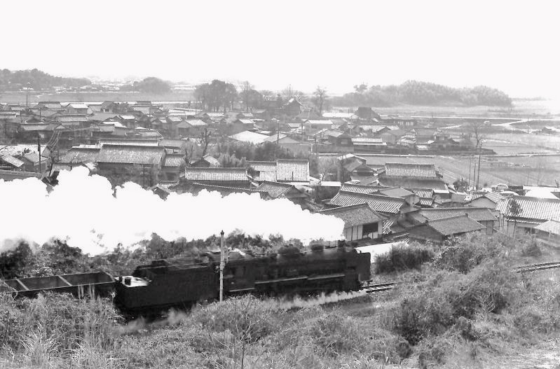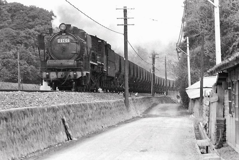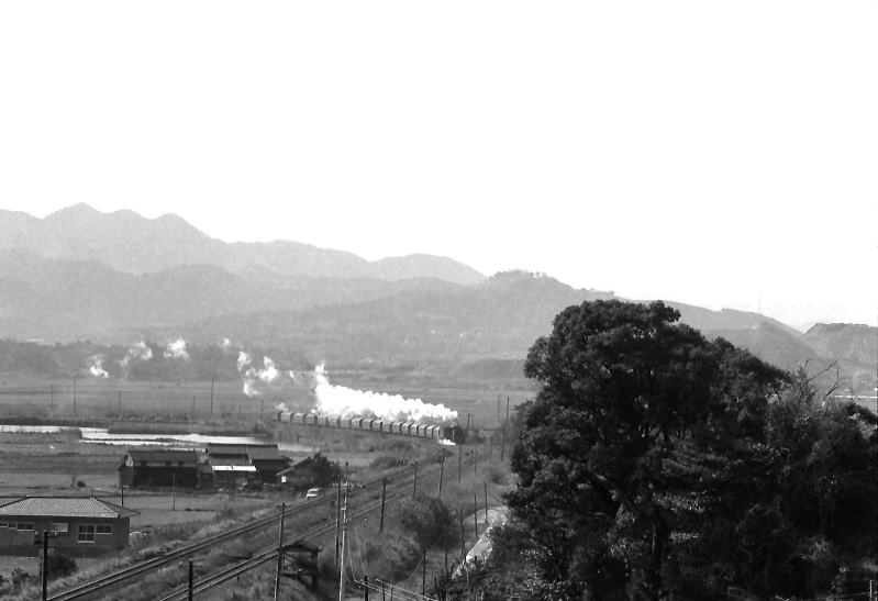 | 筑前垣生の小高い山の上から。飯塚方向からやって来るD60の石炭列車。 |
