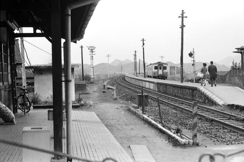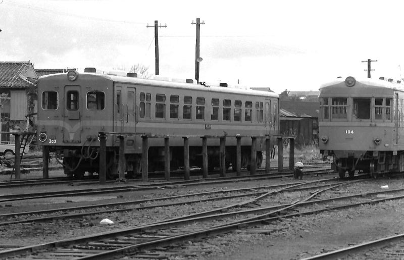 | キハ100系とともに主力だったキハ300系303号車。この車両もキハ17を元にした独自の設計で トイレなしの両運転台式の、結局は後に登場する国鉄キハ10と同じ仕様にはなりましたが、 キハ10より一年早く先にお目見えした鹿児島交通オリジナル車両でした。 エンジンもDMH17ではなく180馬力の三菱DML-2で、当時のキハ17系よりは強力でした。 |