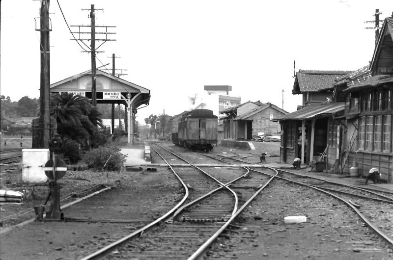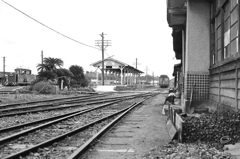 | 南国ムードの加世田駅。ホームの向こう側にも古典的気動車の姿。 この場所は現在、南薩鉄道記念館になっているようです。 航空写真 |