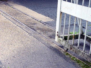 実は鉄材の会社のクレーンのレールです。軌道幅約10メートルの巨大線路。水色がクレーンの一部。 さすがに踏み切りはナシ。 |