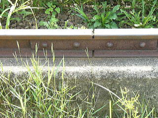 奈良県にて。2005年8月 撮影 まぎれもなく線路・・。たんぼのなかにこんなレールが。 しかも田んぼ道のすぐ横に走っています。 |