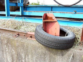 レールは100メートルくらいで終わっていて、端っこにはこんな車止めレールも。一応タイヤで保護している。 |