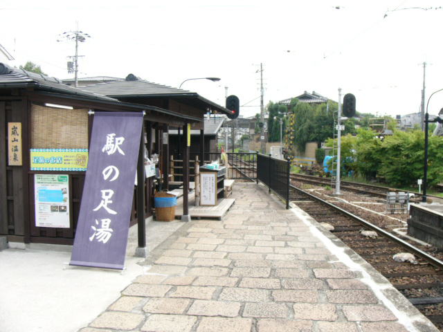 | 嵐山駅ホームの先っちょにある足湯。足湯は有料。となりに土産物屋さんも。 |