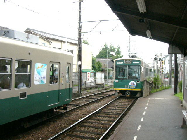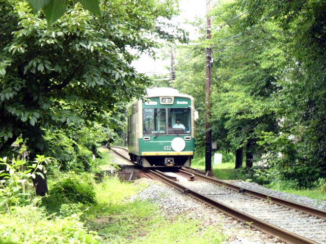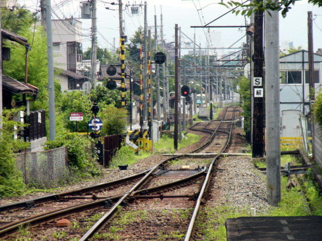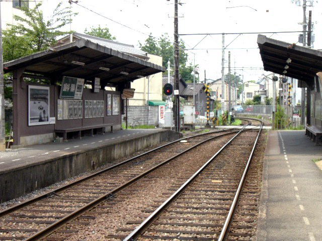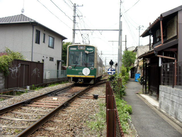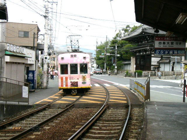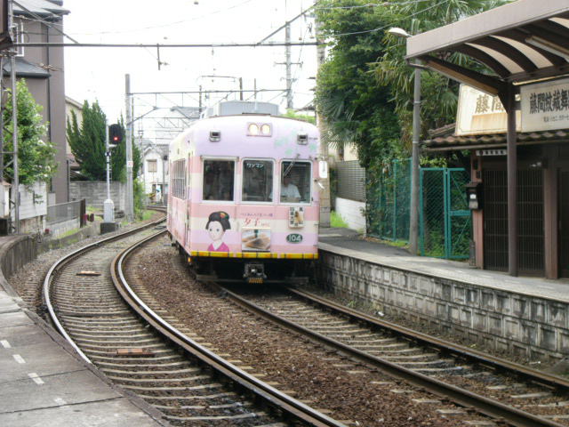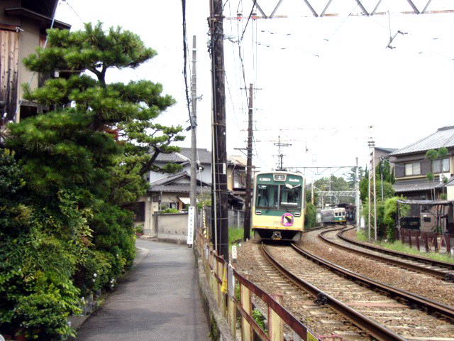 | 竜安寺駅に入る帷子ノ辻行き。線路と道の間隔が非常に近く、あまり体を乗り出すと危ない。 |