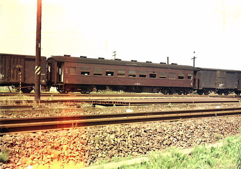 貨車の間に挟まれてどこかへ回送されるオハフ33 |