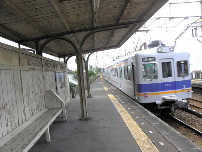 | 木津川駅も古レ―ルでしたが、西天下茶屋はまた趣の違った曲線的な使いかた。 ベンチは仕切りがあって駅舎と一体型。仕切りが必要なほど人が鈴なりになったのでしょうか。 |