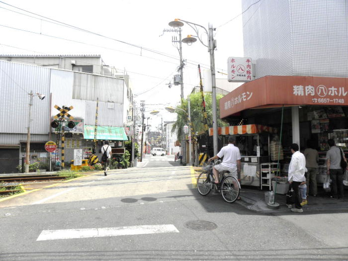 | 踏切の反対側から。このあたりに来てようやく大阪の街と言う感じに。 |