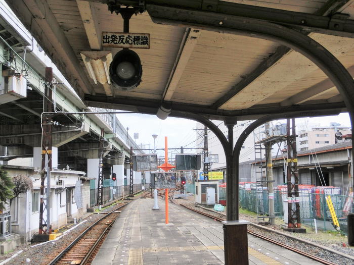 | 再び去って行く岸里玉出行き。見送る駅員氏。こういう情景は大阪市内でも滅多に見られなくなりました。。 |