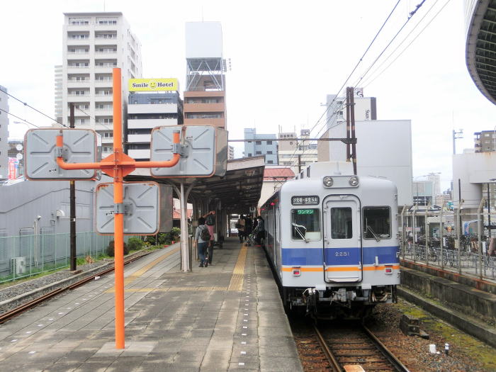 | やってきた2両連結の電車。ひと編成がここと岸里玉出駅の間を行ったり来たりしています。 |
