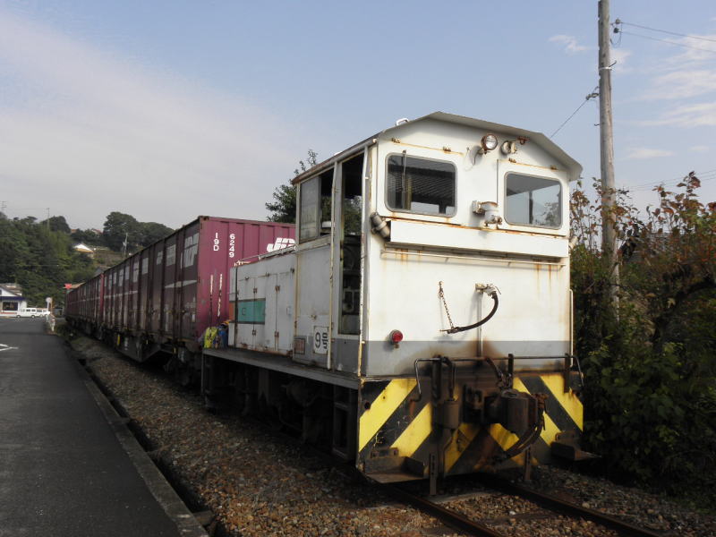 | コンテナの入れ替えに出て来たのか、列車はこれからここで約20分ほど止まっているそうです。 エンジンを止めて動かない列車。機関車は「9号}とだけ書いてあります。 |